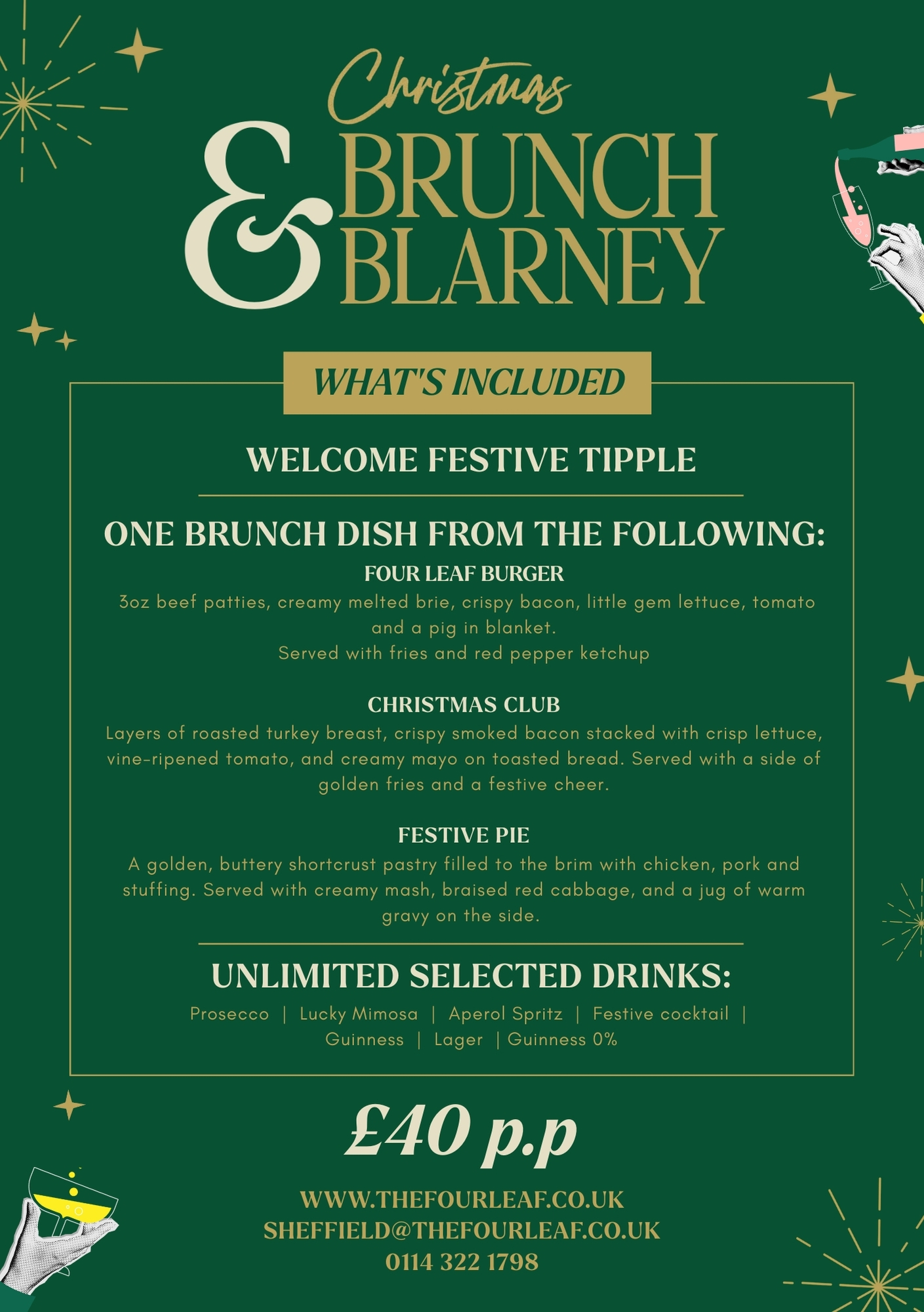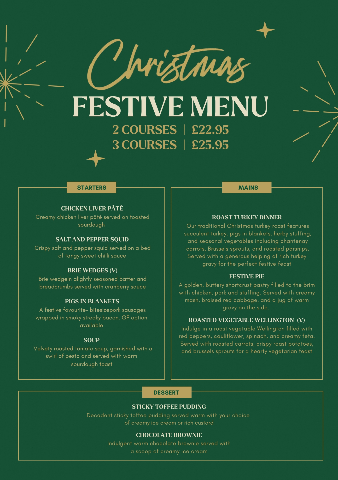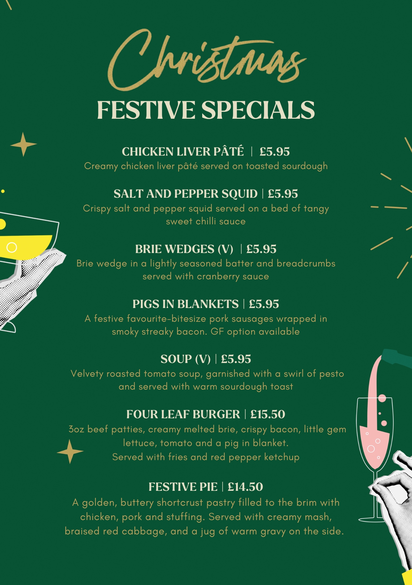 Our festive 2 or 3 course dinner is the perfect way to celebrate the season. Enjoy timeless Christmas classics alongside seasonal specials and a few of our own Four Leaf twists to make vour evening truly memorable. Whether it's a cosy catch-up or a big festive get-together, our menu brings a little extra sparkle to every table!